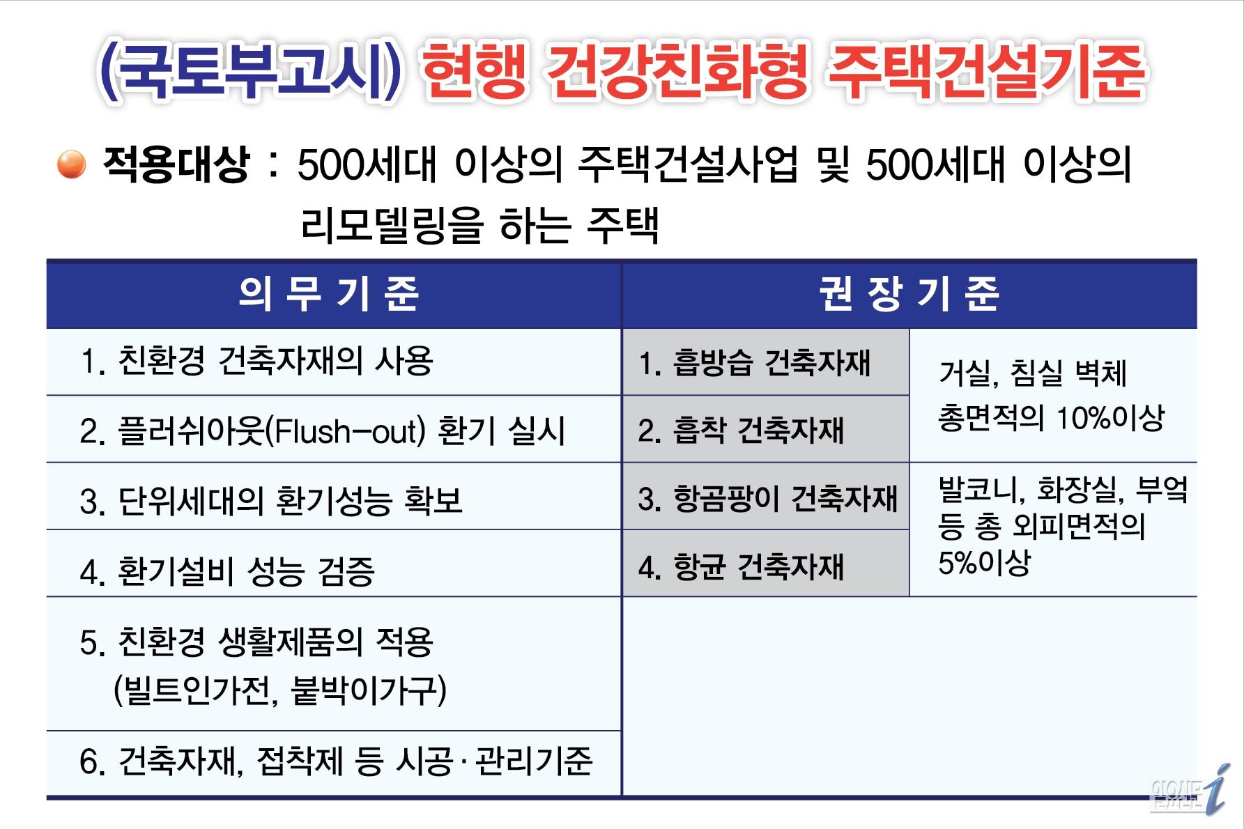 현행 국토부 기준은 500세대 이상의 공동주택을 대상으로 친환경 건축자재 적용 등 6개항목은 의무기준으로 하고 있고, 흡착, 흡방습, 항균, 항곰팡이 등 4가지 기능성 자재는 ‘권장사항’으로 돼있다. 그나마 흡착, 흡방습 기능성자재는 10%, 항균, 항곰팡이 기능성자재는 5%만 시공하면 되도록 기준에서 정하고 있다. 즉, 90~95%는 시공을 하지 않아도 되기 때문에 새집증후군 근절 정책이 실효를 거두지 못하고 있다는 지적이다.