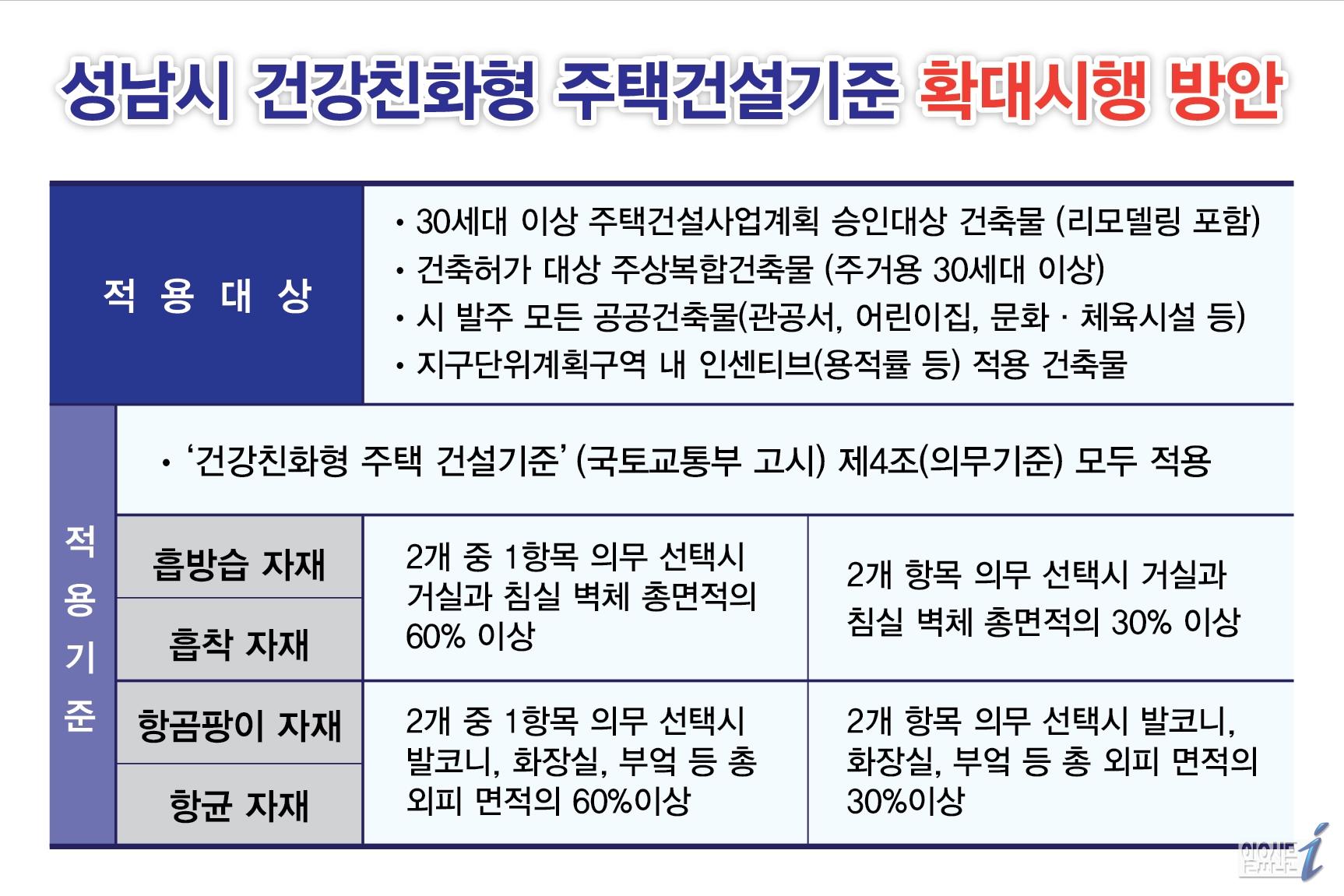 성남시는 이들 건축물에 국토부 고시 ‘건강친화형 주택 건설기준’의 제4조 의무기준을 모두 적용한다. 또한 4개 권장기준(흡방습, 흡착, 항곰팡이, 항균)은 모두 의무적용(총면적 30% 이상)하거나 흡방습 또는 흡착 자재, 항곰팡이 또는 항균자재를 선택적용(총면적 60% 이상) 하도록 해 국토부 고시보다 확대 적용한다.