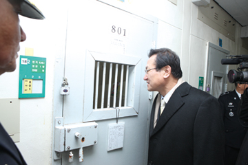 | ▲ 지난 16일 이귀남 법무부 장관이 청송교도소를 방문, 일명 ‘나영이 사건’으로 징역 12년을 선고받은 조두순과 대화를 나누고 있다. 사진제공=법무부 | ||