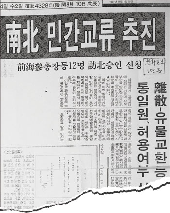 1995년 10월 4일 한 일간지에 거재된 ‘남북 민간교류 추진’ 기사.
