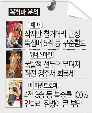 # 베어퀸트로피(3세·암·4전3/1/0·김원숙·박대흥:94)=출전마 중에서 경주 경험이 가장 적은 말이지만 반대로 전력도 가장 베일에 싸여있는 말이다. 4전 3승 2위1회의 전적으로 복승률 100%를 자랑하고 있다. 경주거리는 1400미터까지 경험을 쌓았다. 무한한 잠재력을 갖고 있지만 동시에 치명적인 단점도 있다. 최근에도 양쪽 앞다리에 부종 치료를 받을 만큼 앞다리에 질병을 달고 사는 말이다. 경주 당일 훈련일정과 훈련강도, 컨디션 등을 면밀하게 분석해야 실수를 줄일 수 있을 것이다. 복병마!