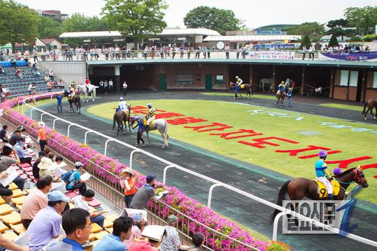 렛츠런파크서울 예시장에서 팬들이 경기에 앞서 말의 상태를 점검하는 모습. 임준선 기자 kjlim@ilyo.co.kr