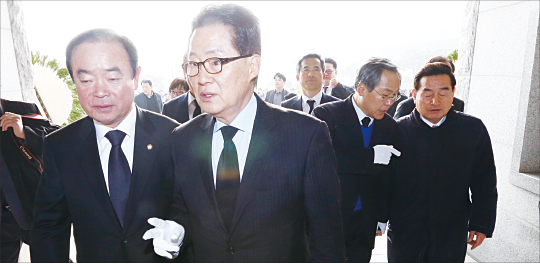 더불어민주당 광주시·전남도당 의원들과 당원·당직자들이 지난 4일 오전 광주 북구 운정동 국립 5·18민주묘지를 참배하고 열사 묘역을 둘러보기 위해 이동하고 있다. 이동 중 왼쪽부터 장병완(광주 남구), 박지원(전남 목포) 의원과 우윤근(전남 광양구례), 이윤석(전남 무안신안) 의원이 각각 당 상황 등에 대해 대화하고 있다. 연합뉴스