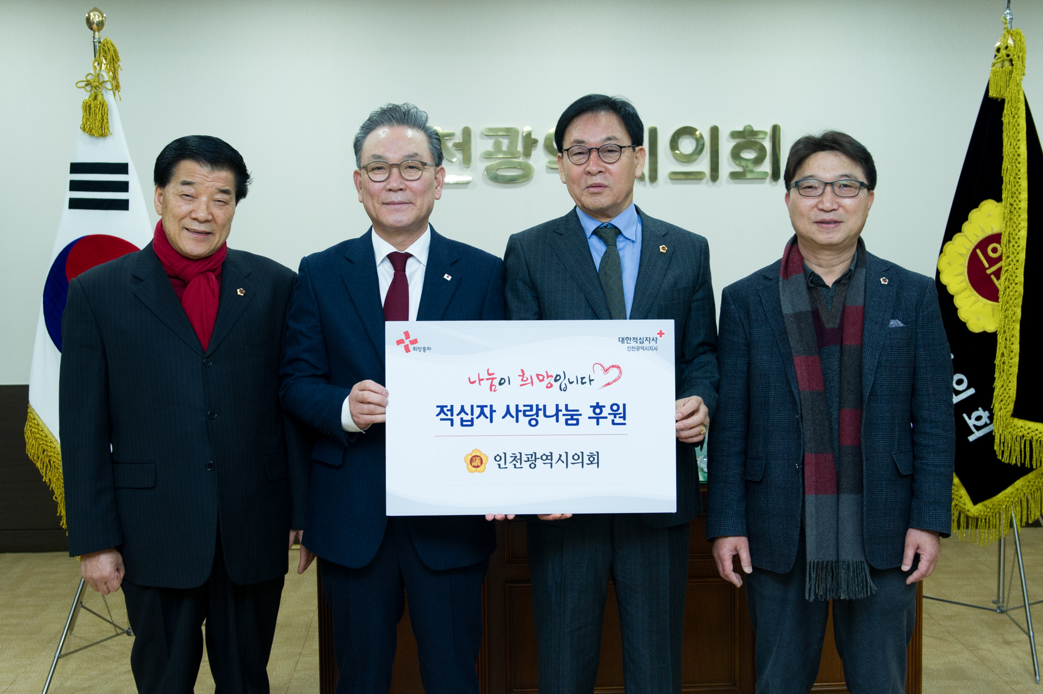 [일요신문]인천시의회(의장 노경수)는 16일 의장실에서 손철운, 최만용 의원과 대한적십자사 인천지사 황규철 회장, 인천지사 홍희자 상임위원 및 구 지구협의회장 등이 참석한 가운데 2016년도 ‘적십자 특별회비’ 전달식을 가졌다.