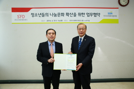 차흥봉 한국사회복지협의회장과 심규현 스마트에프엔디 대표이사는 이날 양 기관 임직원 20여 명이 참석한 가운데 열린 협약식에서 성공적인 사업 수행을 위해 적극 힘쓰기로 다짐했다.