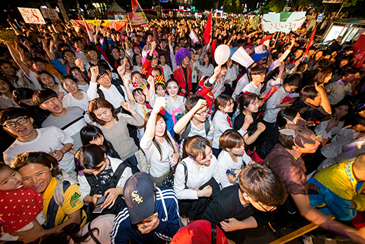 지난 8일 오후 대구 중구 일대에서 진행된 ‘2016컬러풀대구페스티벌’에서 컬러풀퍼레이드 본선 수상팀 발표에 시민들이 환호하고 있다.