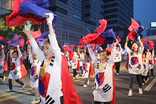 지난 8일 오후 대구 중구 일대에서 진행된 컬러풀퍼레이드에서 유초등가족부 최우수상을 수상한 ‘오필승코리아’팀이 행진을 하고 있다.