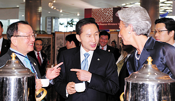 | ▲ 지난 6월 16일 아셈 회의 참석차 제주컨벤션센터를 방문한 이명박 대통령이 강만수 장관, 크리스티네 라가르드 프랑스 재무장관과 이야기 하고 있다. 청와대 사진기자단 | ||