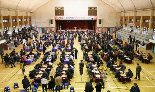 문경실내체육관을 가득 메운 전국의 아마바둑 선수들. 이틀 간 열린 대회에는 전국에서 약 600명의 선수들이 참가해 대회 관계자들을 흐뭇하게 만들었다. 한편 주최측은 문경의 특산품 사과를 참가선물로 제공해 큰 인기를 얻었다.