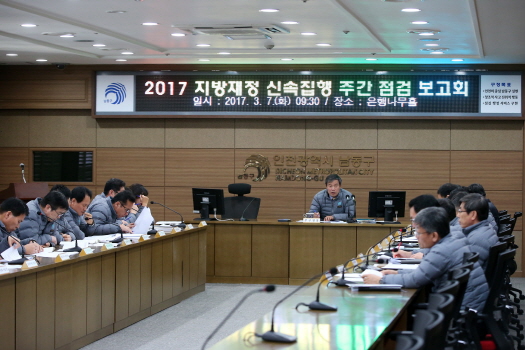 [인천=일요신문]박창식 기자= 인천 남동구(구청장 장석현)는 7일 구청에서 유병윤 부구청장 주재로 주요 사업부서장 20여명이 참석한 가운데 ‘2017년도 지방재정 신속집행 주간 점검 보고회’를 개최했다.