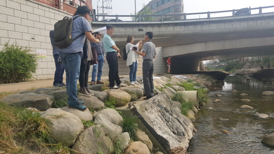 ‘수원천 물고기 폐사 원인분석팀’이 사고 지점을 찾아 현장 조사를 하고 있다.