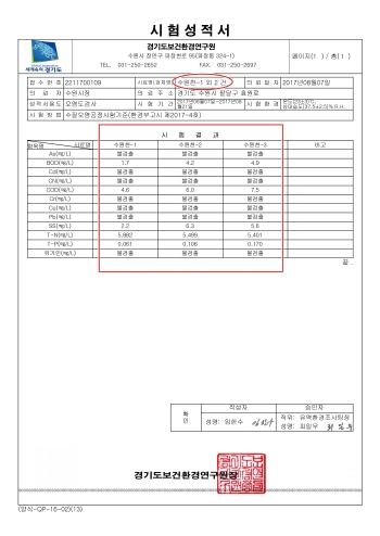 경기도보건환경연구원의 하천수 시료 분석 결과지