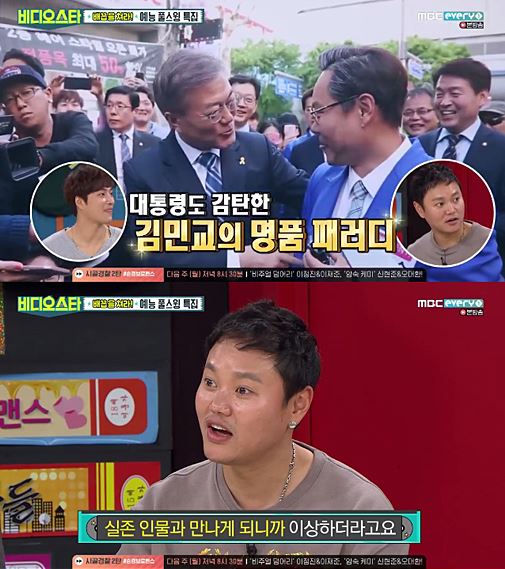 이날 김민교는 문재인 대통령을 실제로 만난 것에 대해 “사실 부담스러웠다. 실존 인물 만나니까 이상했다”고 말했다.