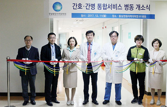 동남권원자력의학원이 11일 ‘간호 간병 통합 서비스 병동’ 개소식을 가졌다. 왼쪽부터 이수철 시설장비팀장 김종록 경영광리부장 김현주 간호부장 김동원 원장 박상일 진료부장 안진희 노조지회장 김경아 간호과장