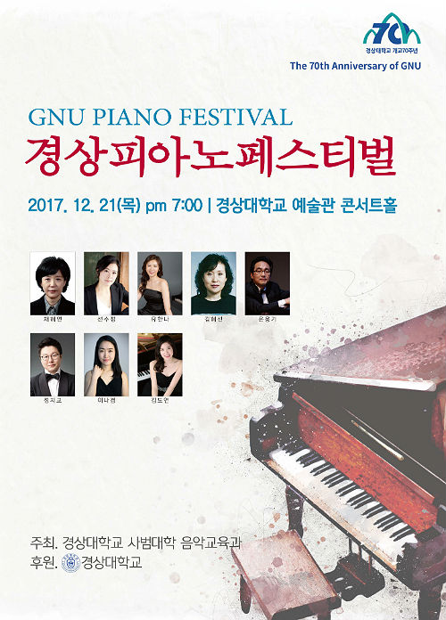 피아노 음악을 감상하며 그동안 고마웠던 사람의 은혜를 생각하고 다가오는 새해를 어떻게 맞이할 것인지 구상하는 시간이 될 것으로 기대를 모으고 있다. 이날 공연은 전석 무료로 진행된다. 자세한 내용은 경상대학교 음악교육과로 문의하면 된다.