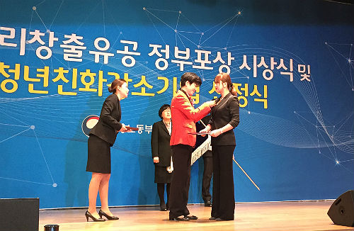 [부산=일요신문] 송희숙 기자 = 경성대학교(총장 송수건) 글로벌비즈니스본부 김유정 씨가 19일 서울 중소기업중앙회에서 열린 고용노동부 주관 ‘2017년도 일자리창출 정부포상 시상식’에서 청년 해외진출 유공 대통령 표창을 수상했다.