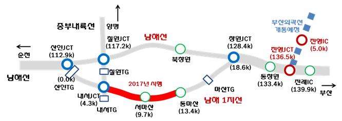 특히 상습정체구간인 남해고속도로(산인~창원), 남해1지선(내서~동마산) 구간의 만성적인 교통정체 해소를 목표로 진행됐다.