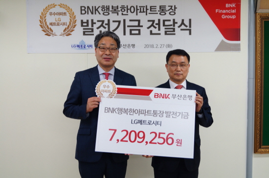 부산은행은 2월 27일 오후 발전기금 전달 대상 아파트를 대표해 LG메트로시티 아파트 관리사무소에 7백만원 상당의 발전기금을 전달했다.