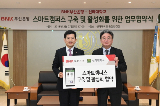 BNK부산은행(은행장 빈대인)은 2월 27일 오후 신라대학교(총장 박태학)와 핀테크 기술을 접목한 스마트캠퍼스 조성을 위해 ‘스마트캠퍼스 구축 및 활성화에 대한 양해각서(MOU)’를 체결했다고 2일 밝혔다.