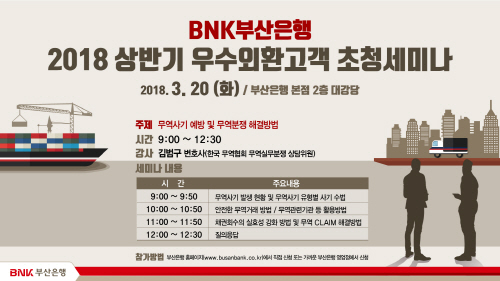 BNK부산은행(은행장 빈대인)이 고객과 시민 300여명을 초청해 ‘무역사기 예방 및 무역분쟁 해결방법’을 주제로 ‘2018 상반기 우수 외환고객 초청 세미나’를 개최한다.