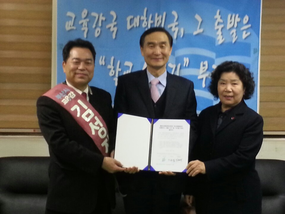 부산시교육감 보수 단일화에 합의한 예비후보들 왼쪽부터 김성진, 이요섭, 임혜경.