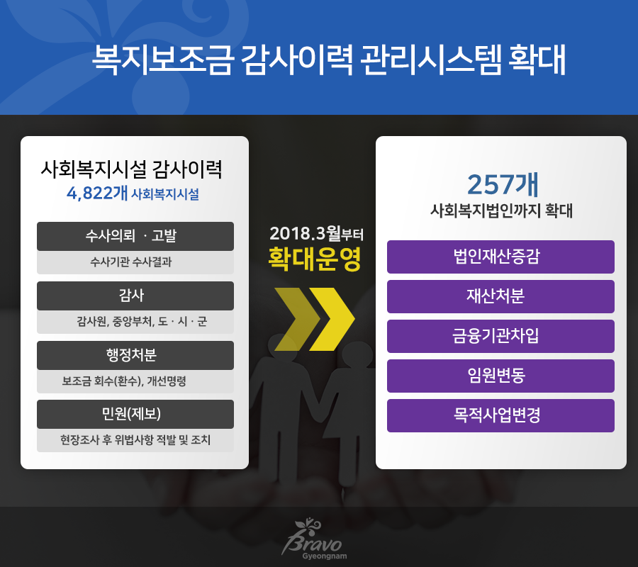 경남도는 복지재정의 누수와 부정수급 비리를 근원적으로 차단하기 위해 3월부터 ‘복지보조금 감사이력 관리시스템’의 적용대상기관을 확대한다고 12일 밝혔다.
