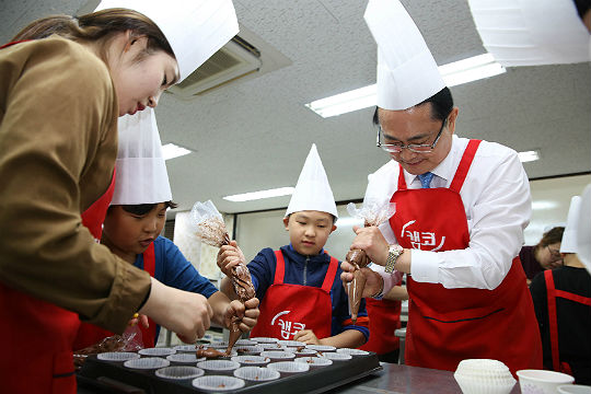 캠코 권남주 경영본부장(오른쪽 1번째)을 비롯한 직원들과 캠코브러리 이용 어린이들이 함께 5월 3일(목) 대한적십자사 부산지사 희망나눔봉사센터에서 ‘사랑의 빵’을 만들고 있다.