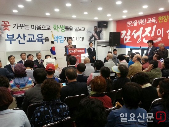김성진 부산시교육감 예비후보의 선거사무소 개소식 모습.