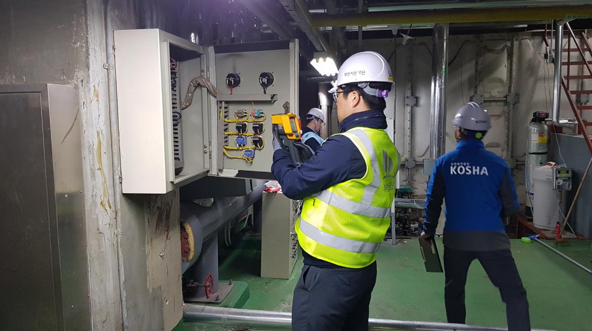 서면지하도상가 중앙몰 기전실에서 부산시설공단 안전기술실 전기직 직원이 안전점검을 하고 있다