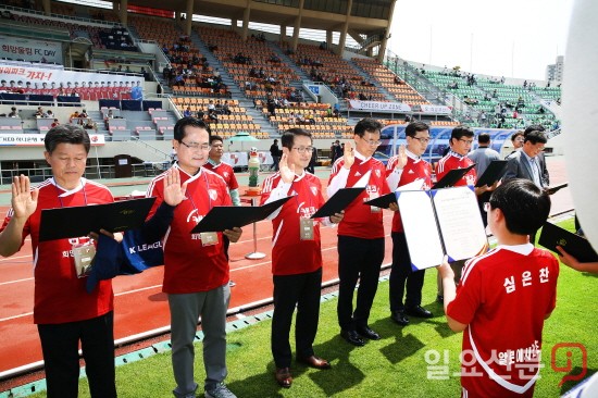 13일 부산 구덕경기장에서 개최된 ‘캠코 희망울림 FC’ 창단 발대식에서 캠코 문창용 사장(왼쪽 세 번째)을 비롯한 관계자들과 각 학교 대표선수가 선서를 하고 있다.
