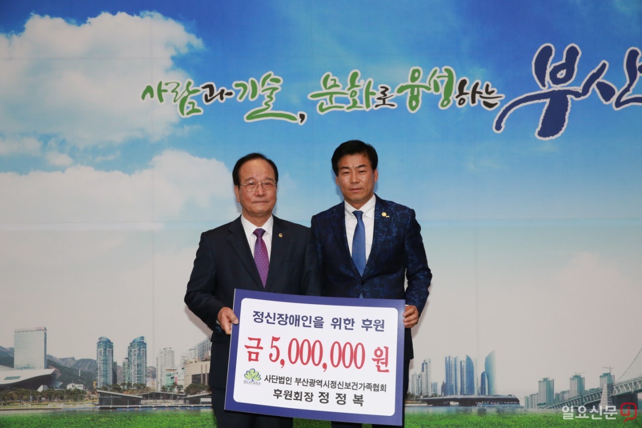 정정복 회장은 정신보건 복지증진을 위해 써 달라며 부산시정신보건가족협회에 500만원을 전달했다. 정 회장은 부산시정신보건가족협회 후원회장을 맡고 있다.