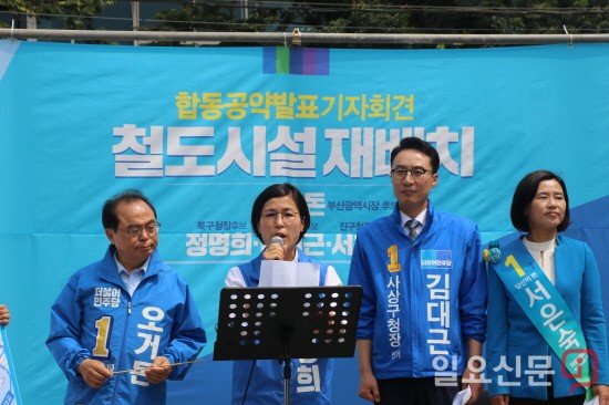 [부산=일요신문] 하용성 기자 = 더불어민주당 정명희 북구청장 후보는 지난 30일 구포역 광장에서 오거돈 부산시장 후보 등과 함께 철도시설 재배치 공약발표 합동 기자회견을 열었다.