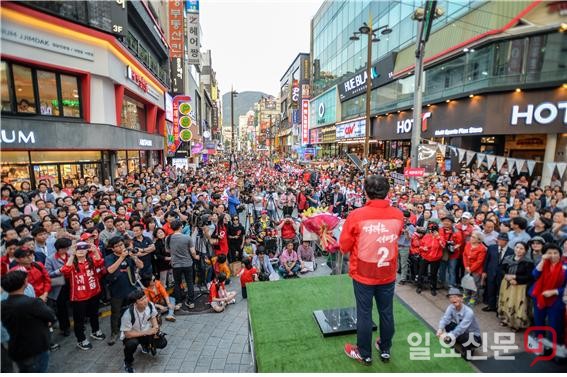 [부산=일요신문] 박영천 기자 = 자유한국당 서병수 부산시장 후보는 3일 오후 6시 서면 쥬디스태화백화점 일대에서 부산시민 2만 명(주최 측 추산)이 운집한 가운데 대규모 유세를 벌였다.<사진>