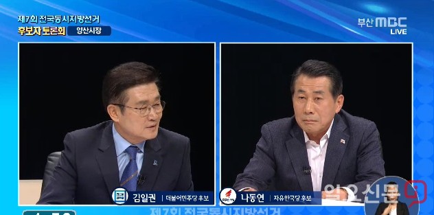 [양산=일요신문] 하용성 기자 = 더불어민주당 김일권 후보와 자유한국당 나동연 후보는 지난 6일 선거관리위원회가 주관하는 부산MBC 양산시장 후보자 토론회<사진>에서 공방을 펼쳤다.