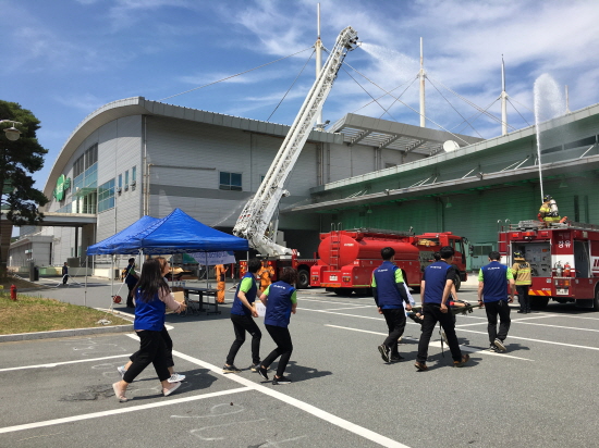 김해유통센터 임직원과 김해서부소방서 소방관들이 함께 훈련했으며, 임직원 대상 소화기 사용법 및 인공호흡법 등 응급조치 교육도 함께 진행했다.