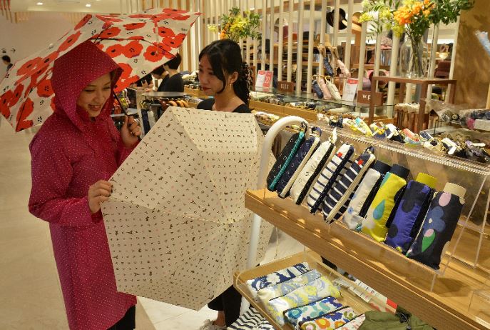 롯데백화점 부산본점 패션잡화 매장에서 장마철 필수품인 우산과 레인코트를 살펴보고 있는 모습