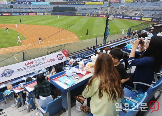 애육원 원생들은 BNK경남은행이 준비한 치킨과 햄버거 등 간식을 먹으며 NC다이노스와 두산베이스의 경기를 관전했다.