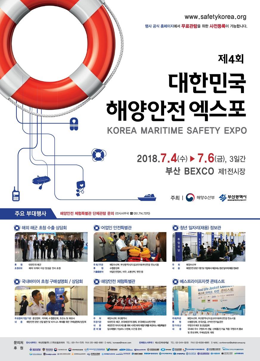 해양안전문화 확산과 관련 산업 지원 및 육성을 위한 전문전시회인 ‘제4회 대한민국 해양안전 엑스포(Korea Maritime Safety Expo 2018)’가 4일부터 6일까지 벡스코(BEXCO)에서 열린다.