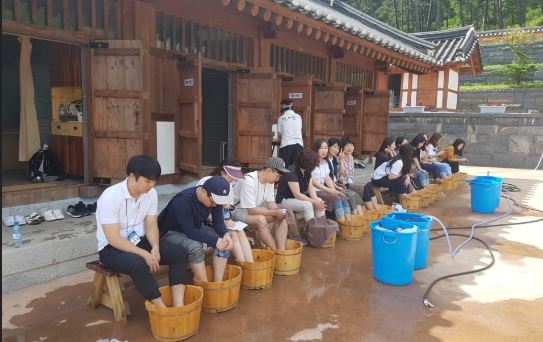 민원담당 공무원들이 산청 동의보감촌에 족욕을 하고 있다.