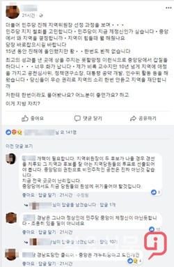 민주당 정책연구소 소장이라고 밝힌 유모씨는 “민주당지지 철회를 고민합니다. 민주당이 지금 제정신인가 싶습니다. 중앙에서 왜 지역을 결정합니까. 지역이 힘들 때 뭘 해줬나요. 당장 바로 잡으시길 바랍니다”하며 “중앙당에서 갑질을 하다니, 너무 화가 납니다”고 심경을 전했다.