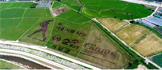 유색벼를 활용한 논아트 조성은 ‘기장군’은 농산물을 통한 스포츠 마케팅 추진, ‘부산상수도사업본부’는 순수 365 홍보마케팅, ‘롯데자이언츠’는 사회공헌활동 마케팅 의미를 담아 유색벼(새일미벼, 자도, 황도)로 이색경관을 연출했다.