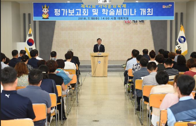 김해시는 2018년 지난 4월 27일부터 5일간 개최된 ‘제42회 가야문화축제’ 평가보고회 및 학술세미나를 18일 시청 대회의실에서 축제관계자, 자원봉사자 등 200여명이 참석한 가운데 개최했다.