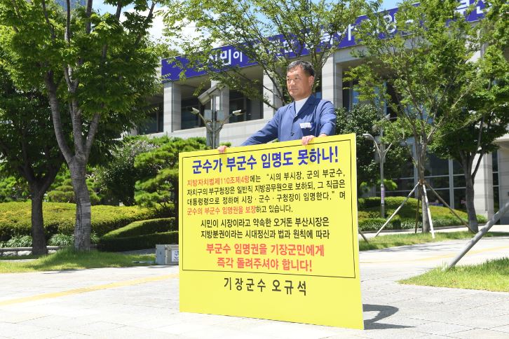 앞서 오규석 기장군수는 부군수 임명권 반환을 촉구하는 무기한 1인 시위를 업무공백을 최소화고자 매주 화요일 점심시간을 이용해 부산시청 시민광장 앞에서 이어나가겠다고 밝혔다.