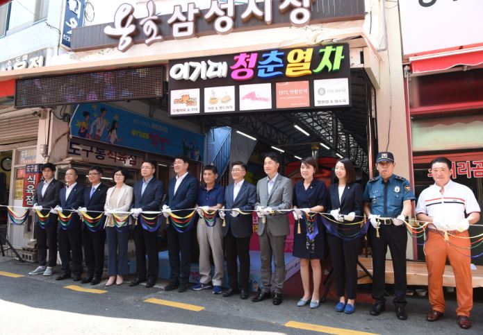 [부산=일요신문] 박영천 기자 = 부산남구청과 소상공인시장진흥공단은 지난 20일 용호삼성시장에서 중소벤처기업부 공모사업인 청년상인 창업지원사업으로 조성한 용호삼성시장 이기대청춘열차‘ 개장식 행사를 가졌다.