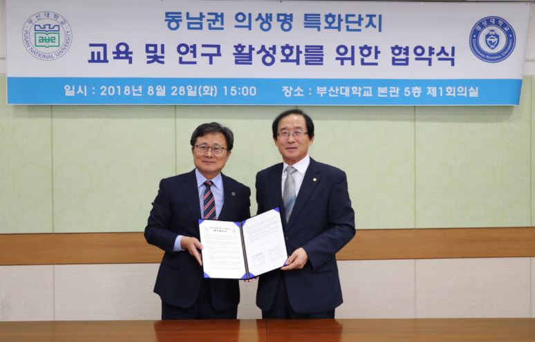 [경남=일요신문] 정동욱 기자 = 국립 경상대학교(GNUㆍ총장 이상경)와 부산대학교(PNUㆍ총장 전호환)는 지난 28일 오후 3시 부산대학교 대학본부 5층 제1회의실에서 문재인 대통령 지역공약인 ‘동남권 의생명 특화단지 교육 및 연구 활성화’를 위한 업무협약(MOU)을 체결했다.