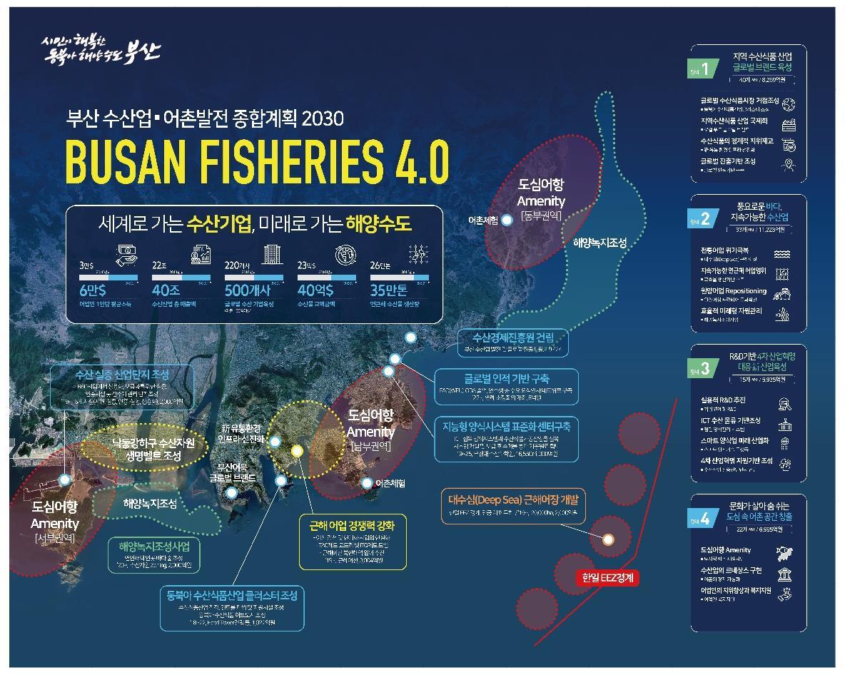 Busan Fisheries 4.0은 지역 수산업을 미래 신성장산업으로 육성하기 위한 ‘수산업․어촌 발전 전략’이다.