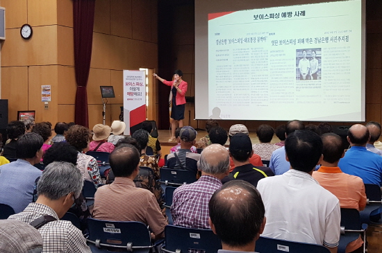 금융소비자보호부와 홍보부 사회공헌팀 직원들은 성산노인종합복지관(창원시 성산구 창이대로 781)을 방문해 노인 100여명을 대상으로 전화금융사기 수법인 보이스피싱에 대해 교육했다.
