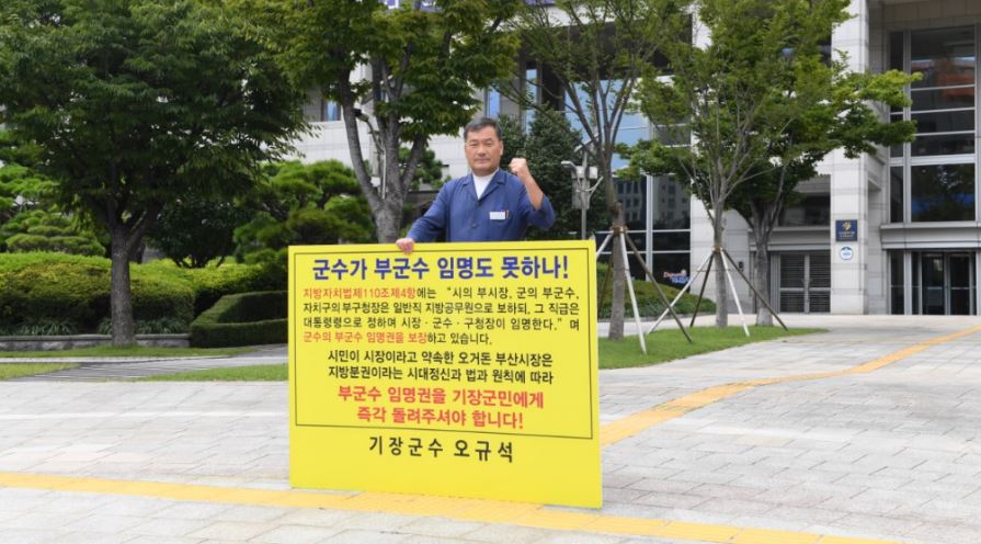 기장군은 열 번째 1인 시위가 진행된 27일 오전에도 부군수 임명권을 돌려달라는 내용의 14번째 정식 공문을 부산시에 발송했으며 부군수 임명권이 반환될 때까지 지속적으로 공문을 발송할 계획이다.