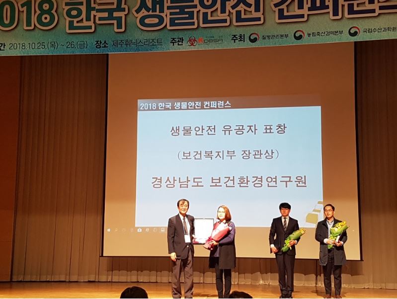 경남보건환경연구원이 생물안전관리 우수기관으로 선정돼 보건복지부장관 기관표창을 수상하고 있다.