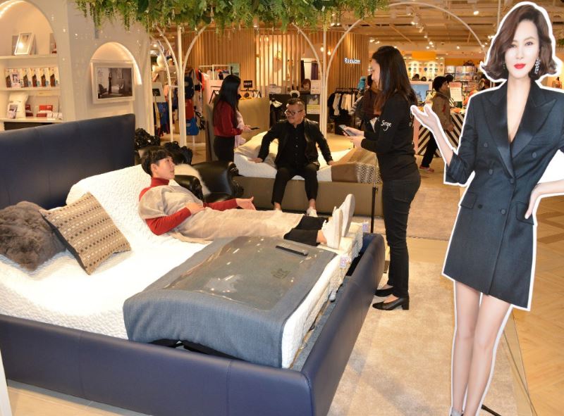 롯데백화점 부산본점 6층에서 진행하는 피졸로 모션베드 행사에서 고객이 제품을 체험하고 있는 모습